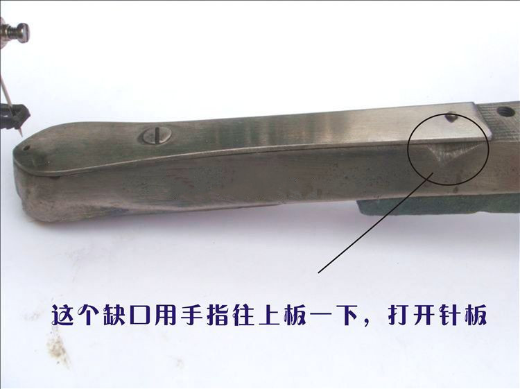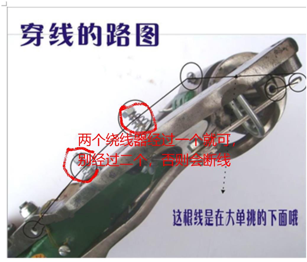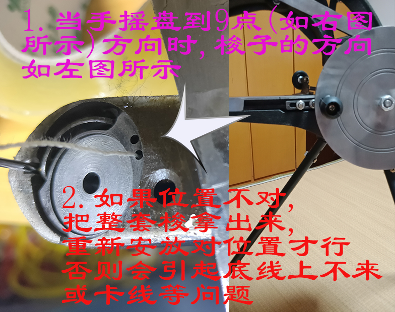 4.放梭的位置即手摇导盘,在针刚要上升时,梭尾要对准针槽,并将线头抽出2-3寸长,按如梭床半月槽内再关上上针板,摇动大盘,可将底线带到针板上,如梭托摆放的位置错误,底线带不上同时上线断线。